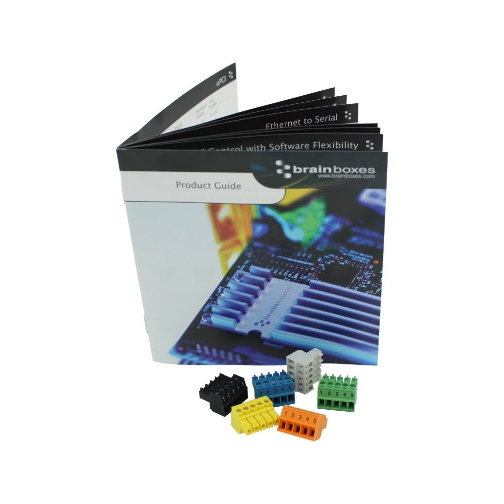 6 coloured PCB connectors suitable for Brainboxes Industrial Ethernet to Serial (ES-5XX), Industrial Ethernet I/O modules (ED-5XX) and BB-400. Individually numbered pins simplify wiring and remove confusion. 5 x 3.5mm pitch screw connections with tension sleeve.