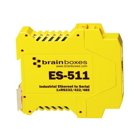 Ethernet to Serial Device with 1 Port software selectable as RS232, RS422/485 Full duplex or RS422 Half duplex. ES-511 has removable Screw Terminals Blocks for easy wiring, a slim ‘end on’ case and integral DIN rail mount.