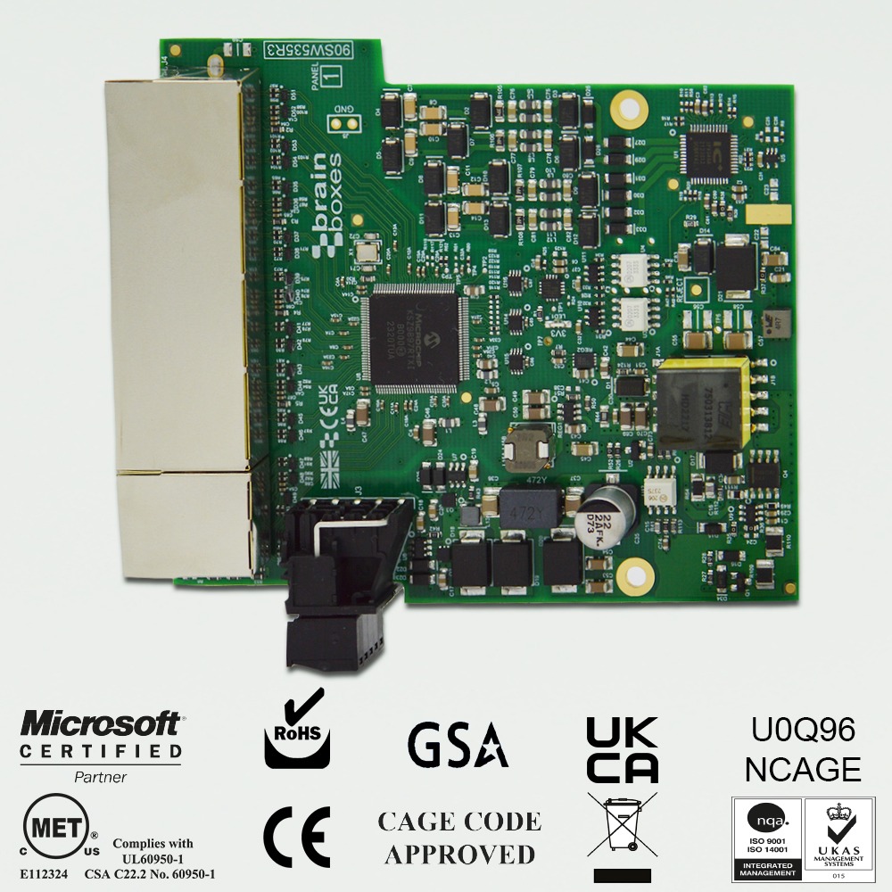 Galvanically Isolated Ethernet brainboxes-ed-593-front-panel-ethernet-port-status-leds capable of 10/100/1000 Mbps. Industrial temperature range of -40°C to +70°C (-40°F to 158°F) and dual input redundant power supply with wide voltage range means it can be powered from USB or on the 24V factory floor. Power terminal is removable with numbered pins for easy wiring. Power consumption is optimised based on the status of the link device. No software required.