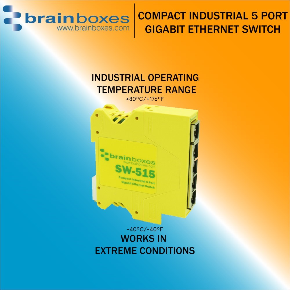 Compact industrial 5 port Gigabit Ethernet unmanaged switch. Galvanically Isolated Ethernet brainboxes-ed-593-front-panel-ethernet-port-status-leds. Automatic detection of data transmission speed: 10/100/1000 Mbps. Industrial temperature range of -40°C to +80°C (-40°F to 176°F) and dual input redundant power supply with wide voltage range means it can be powered from USB or on the 24V factory floor. Only 23mm wide and 94mm deep. Power terminal is removable with numbered pins for easy wiring. Power consumption is optimised based on the status of the link device. No software required. Ideal for factory floor, in vehicle and marine applications.