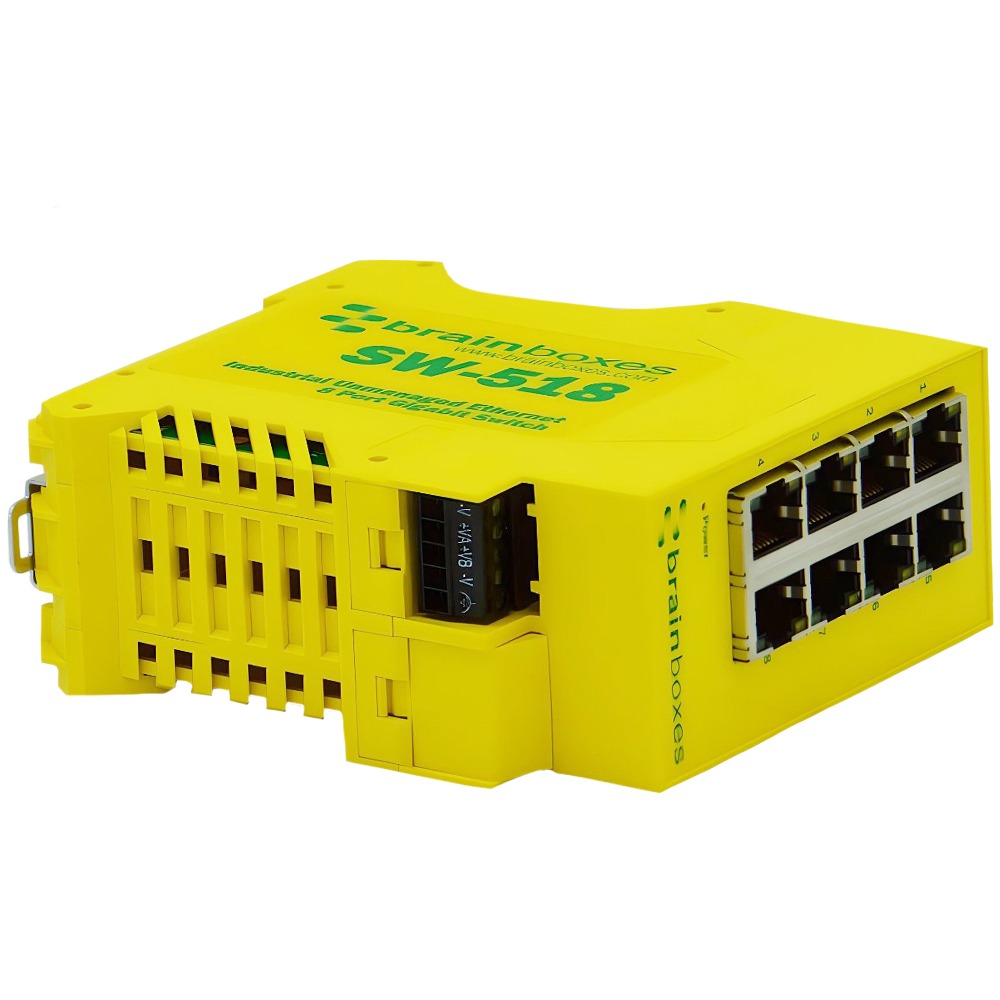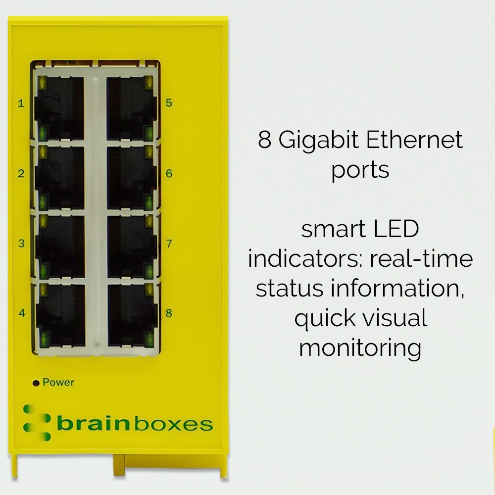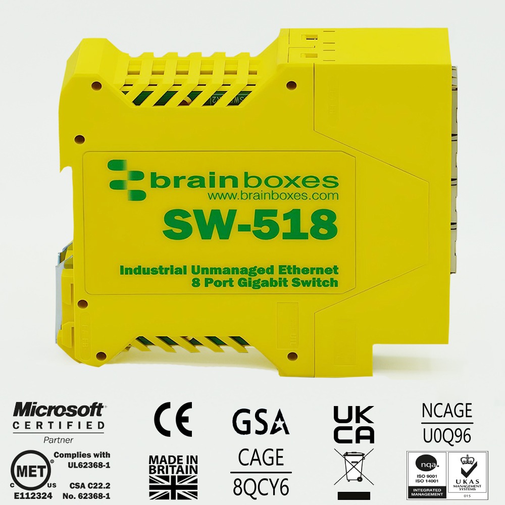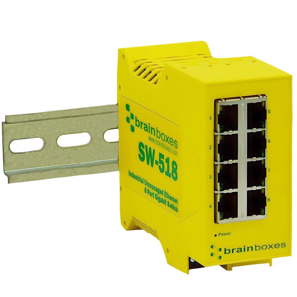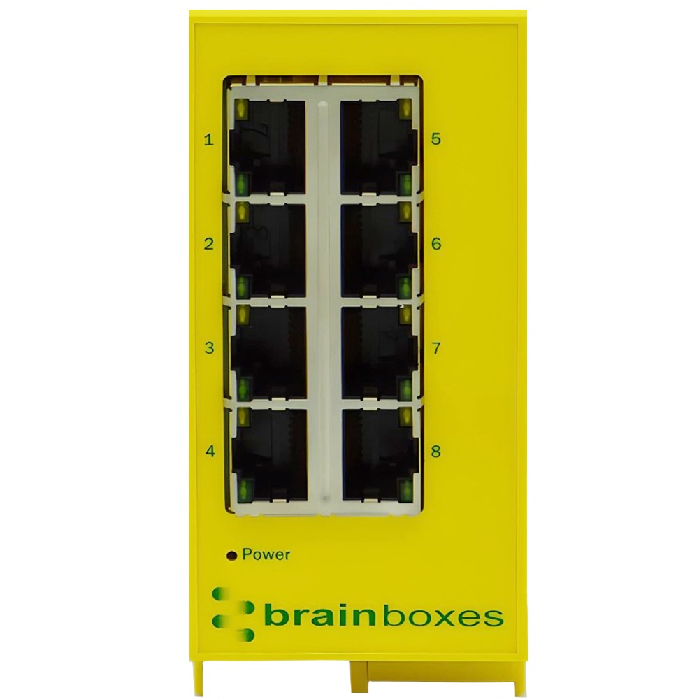 Industrial 8 port Gigabit Ethernet unmanaged switch. Galvanically Isolated Ethernet brainboxes-ed-593-front-panel-ethernet-port-status-leds. Automatic detection of data transmission speed: 10/100/1000 Mbps. Industrial temperature range of -40°C to +80°C (-40°F to 176°F) and dual input redundant power supply with wide voltage range means it can be powered from USB or on the 24V factory floor. Only 23mm wide and 94mm deep. Power terminal is removable with numbered pins for easy wiring. Power consumption is optimised based on the status of the link device. No software required. Ideal for factory floor, in vehicle and marine applications.