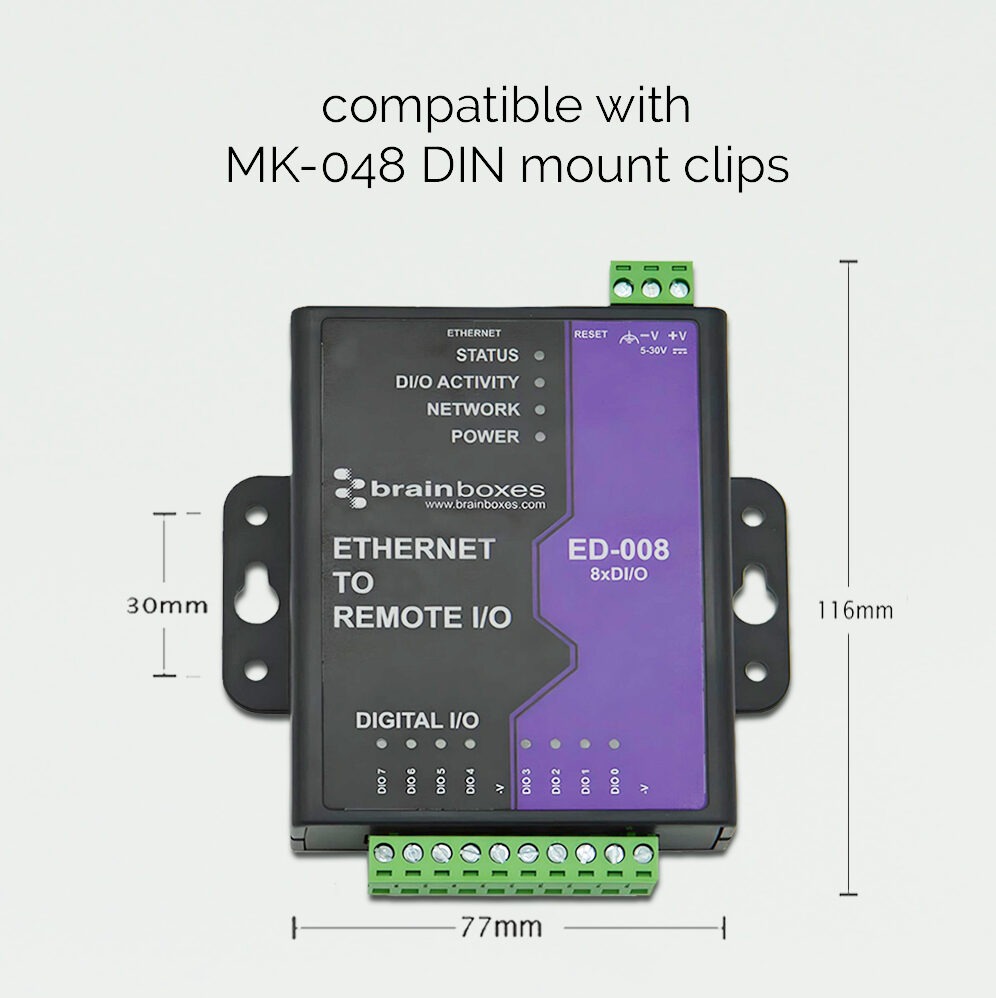 Ethernet to DIO device: 8 digital input/output channels. Powerful ARM 80 MHz, 32 Bit CPU. Offers robust and intelligent ‘control side’ devices that provide the interface to systems on the 24V factory floor environment, commonly referred to as ‘process side’. The device installs as a COM Port on the PC to give complete backwards compatibility essential for legacy applications.