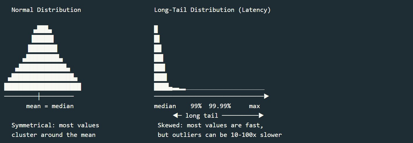 Most people assume that if the average response time is 0.5 ms, almost all responses will be close to 0.5 ms. However, latency doesn’t follow a nice, symmetrical bell curve. Instead, latency has a long tail. The vast majority of responses are fast and tightly clustered, but a small number of outliers are dramatically slower: 10x, 50x, even 100x the median. Those rare outliers are exactly what your users experience.